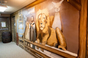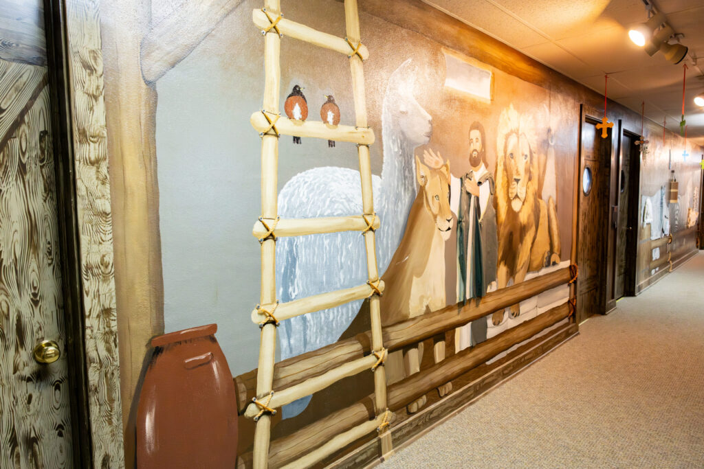 Our beautifully painted Sunday School wing allows students a peek inside the Ark, a market, a theater, a nomad’s tent, and the royal castle grounds.